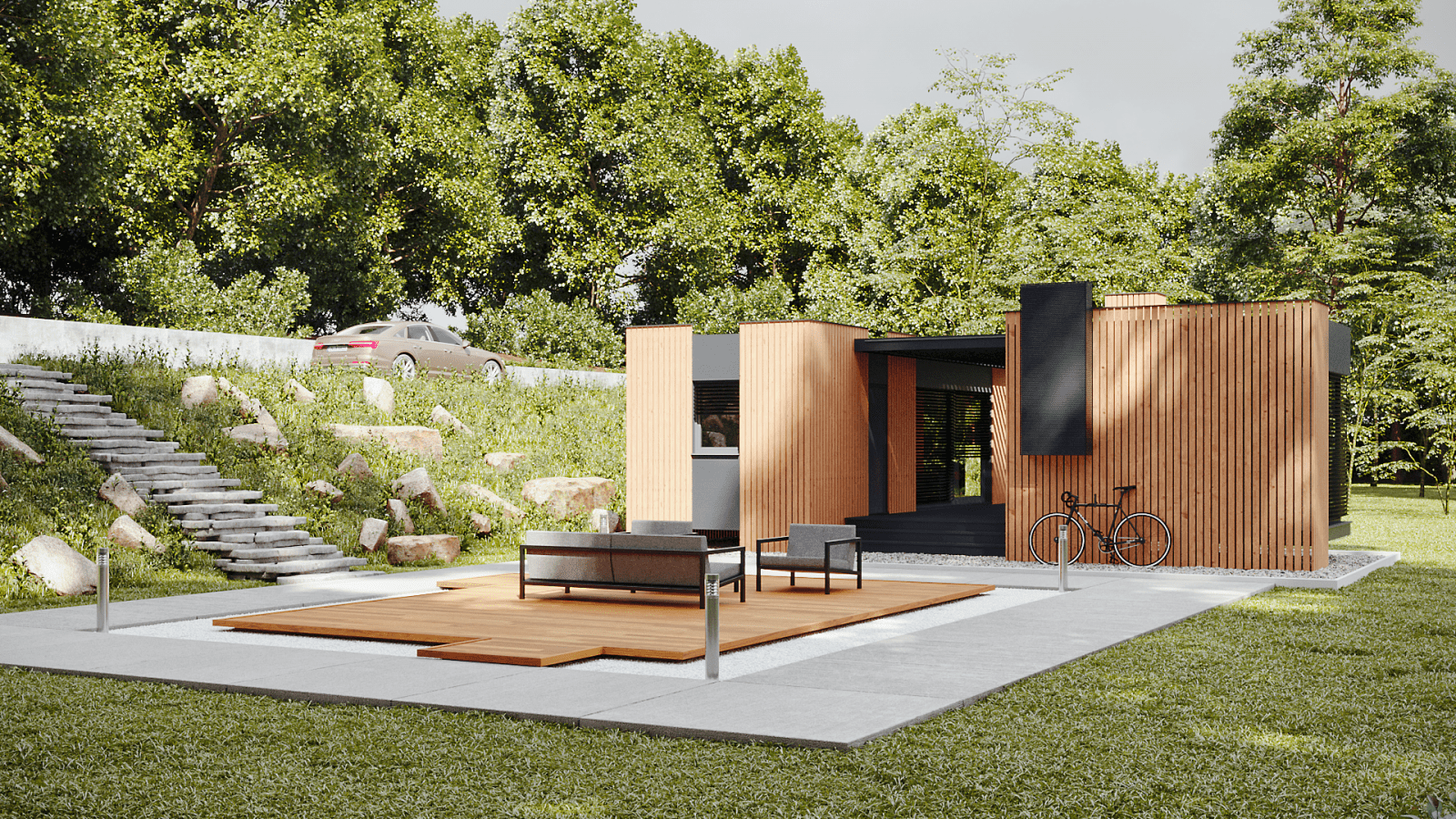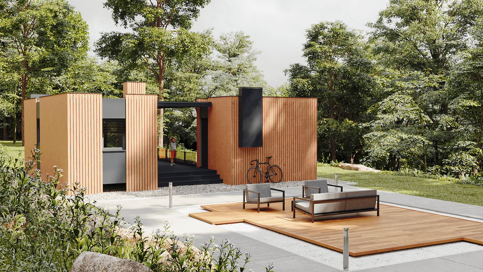MMH21_M.02 is a modular unit consisting of two mobile facilities, which are designed to accommodate four people. A large wooden terrace is a place to meet and socialize, and connects the living area and bedroom. The terrace can be equipped with a standard barbecue module, as well as a bioclimatic pergola, to make your stay in nature pleasant. Modern design follows every segment of the composition, which makes it complete and recognizable.