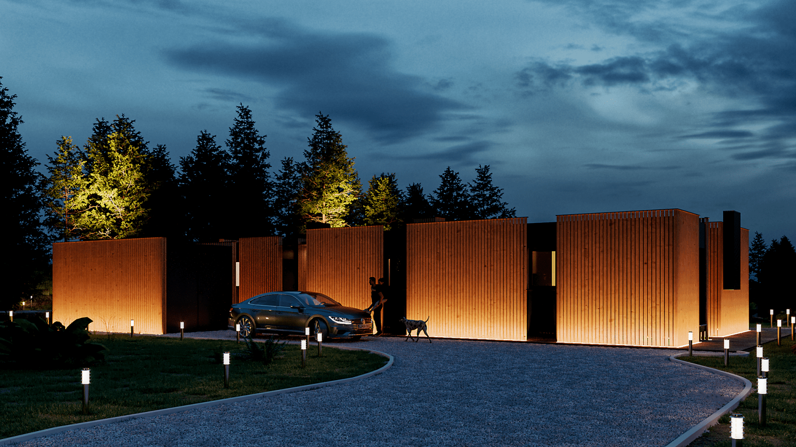 Freestanding module - garage with a total area of 16m2. it consists of a steel structure and a roof with a wall cladding of facade wooden decor. Electrically operated garage rolling shutters